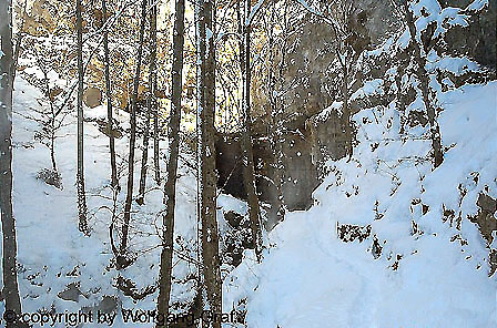 as Höhlenportal im Winter. (Absturzgefahr)